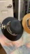 Elegant CHANEL straw hat in tan. Features a black logo band and white pearl details for a sophisticated look.