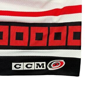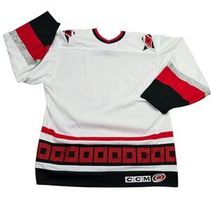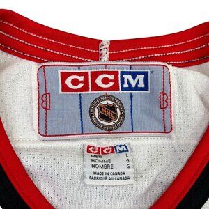 White hockey jersey with red and black accents. Features bold logo on front. Classic CCM design.