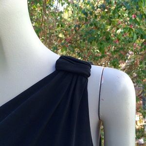 Gorgeous one shoulder black dress with angled bottom! Very sleek and slimming. Size 10, fully lined, 100% polyester. Worn about 4 times. Smoke free home.