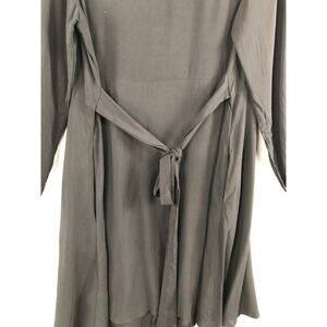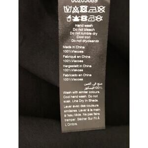 100% viscose, hand wash, button front, tie belt, long puffy sleeves, v-neck