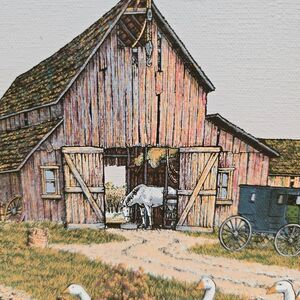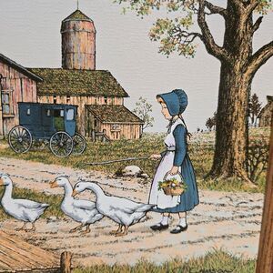 C.Carson Serigraph Vintage Oil Painting Barn Girl Geese Amish Folk Farm Signed