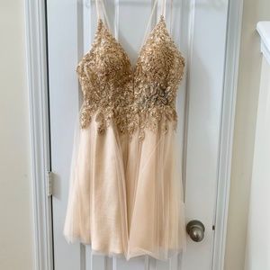 A-line short gown with layered tulle skirt and embellished lace applique bodice.