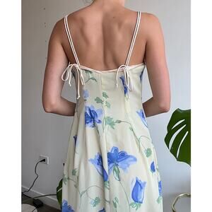 Gorgeous vintage wedding guest dress. The base color is a pale butter yellow and the print has almost watercolor looking sea blue tulips. There are two satin straps on the top and each features a bowtie detail.