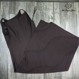 An enchanting brown evening gown from CDC, adorned with delicate beading that catches the light most becomingly. This gracefully draped dress, crafted from a luxuriously soft blend of materials that ensures both comfort and elegance, has been cherished yet remains in splendid condition.