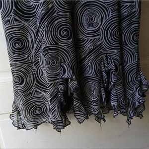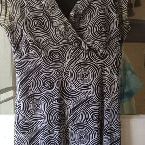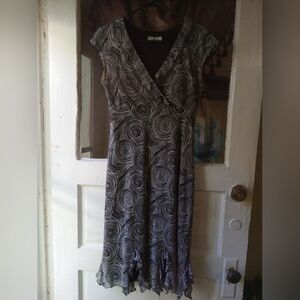 Lightweight flowy sheer Petite, abstract print, v-neck dress. No zipper/no buttons. Polyester & spandex, fully lined in Polyester. Size 8.