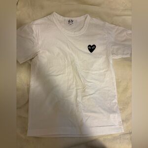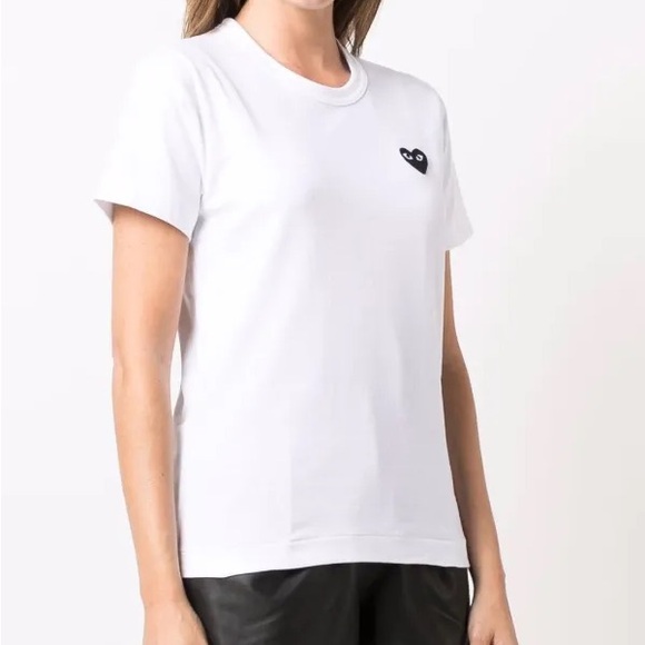 Soft white womens' tee with a small black heart logo Comme Des Garçon. Comfortable cotton knit for everyday wear. Simple, versatile design that pairs easily with any outfit. Machine washable for easy care.