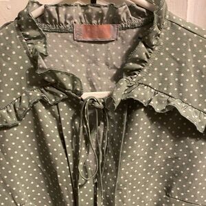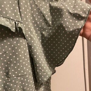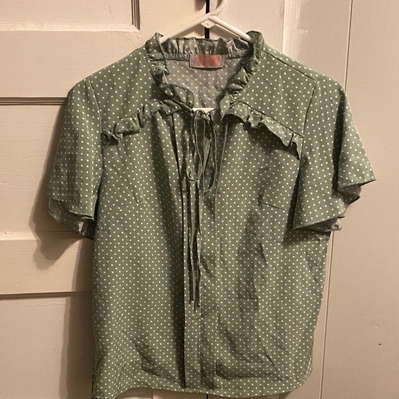 Chic green blouse featuring white polka dots and ruffle detail. Perfect for casual or formal occasions. SS