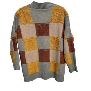 This cozy C+D+M women's cardigan is a multicolor, medium-sized colorblock sweater designed in a patchwork theme. Made from polyester, it features a V-neckline, long sleeves, and a checkered pattern with a button-up front. Suitable for all seasons, it requires dry cleaning and was manufactured in China. The item is pre-owned but in excellent condition with no rips, tears, or holes, and comes from a smoke-free home.