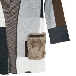 C+D+M Collection open front cardigan sweater. Neutral colorblocking colors. Faux fur pockets.
