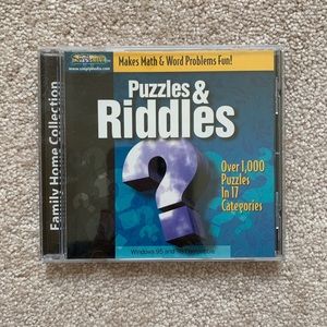 ‘Puzzles & Riddles’ cd-rom game from Simply Media, Family Home Collection. This game disc is compatible with Windows 95/98. In great working condition! Perfect for older computers or retrogaming! Includes multimedia brain twisters & teasers with animation, sounds and music; challenges problem solving, thinking & creativity skills; over 1,000 puzzles in 17 categories. Puzzles & Riddles helps each member of your family develop their math & seductive skills while having a lot of fun along the way.
