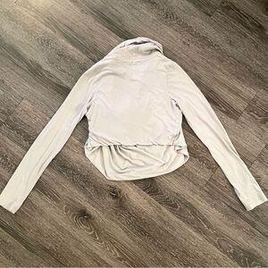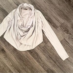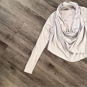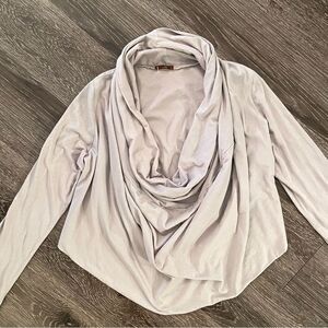 Gently worn in excellent condition. This is a drape front blouse which gives the illusion of an infinity’s scarf but is all one top with sleeves. A bit cropped