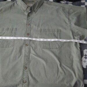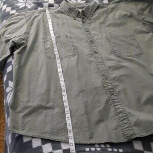 C.E. Schmidt Army Green Short Sleeve Chest Pockets Work Button Down Shirt 2XL. Measurements are approximate. Chest 28 inches. Length from shoulder to hemline 32 inches. 100% cotton. 3 button from the bottom is missing & has a tear. Can replace with bottom button. Extra Small button at hemline. See all photos above. Questions and offers welcome.