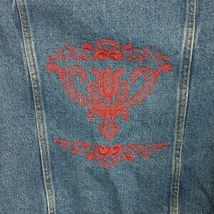 Traditional "fit for her" jean jacket with red tulip & filigree embroidery between the buttons and on the back.