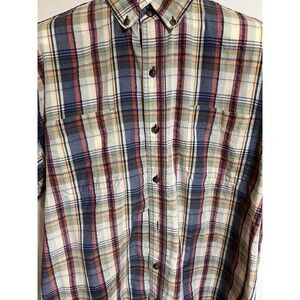 This is a C.E. Schmidt button-up shirt in size 2XLT, featuring a plaid pattern in beige with accents of tan, black, and orange. It has a collared neckline, long sleeves, and a button-down closure. Made from a cotton blend fabric, this shirt is easy care and machine washable. It is designed for business, workwear, casual, and travel occasions, and includes pockets for added convenience.