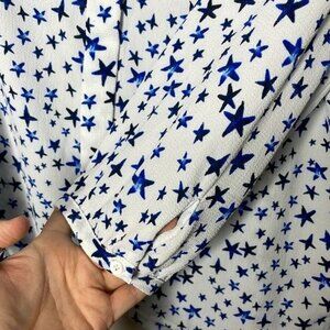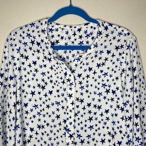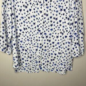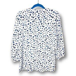 C&E Size M White Blue Stars Patriotic Gauzy 1/4 Button Flowy 3/4 Sleeve Blouse