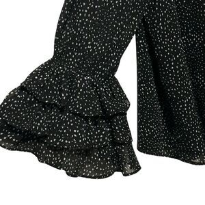 NWT, Size: L, Color: Black/White, Dot Print, Smocked off-the-shoulder neckline, Long sleeves with tiered ruffled cuffs, Lined bodice, Relaxed fit, 100% Polyester, Machine washable