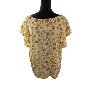 CECE Women's Top Blouse XL Yellow Brown Floral Polyester Spandex Fall