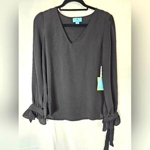 NWT Cece size XS black long-sleeved V-neck sleeve ties blouse. Pullover style. Long sleeves with ties at wrists. Bell sleeve.