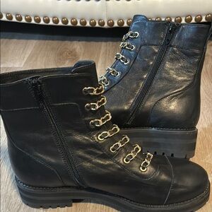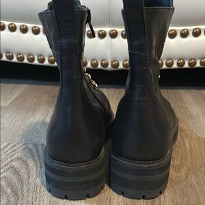 These CECELIA NEW YORK combat boots feature a striking black and gold color scheme, offering a rugged yet fashionable look. Crafted with a high-top design and durable rubber sole, they ensure both style and protection. The hardware adds a touch of elegance to their robust construction. Size 8M in EUC.