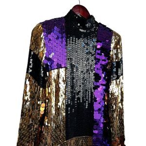 The product is a vintage party dress made by CEDARS. It is a size 4 and has a colorblock design with black, gold, and purple sequins on silk material. The dress has a mock neck, long sleeves, and a zip closure. It is a short mini dress with a metal theme and is suitable for formal occasions such as weddings and parties. The dress is lined and can be worn in the fall, winter, and spring seasons.