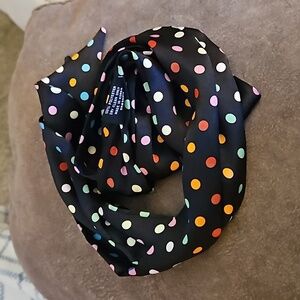 Accessorize with flair using this CEJON scarf, featuring a playful black rainbow polka dot design. This skinny satin scarf can be styled as a coquette bow tie or sash, adding a touch of charm and versatility to any outfit. Perfect for fashion enthusiasts looking to elevate their accessory game with a whimsical twist.