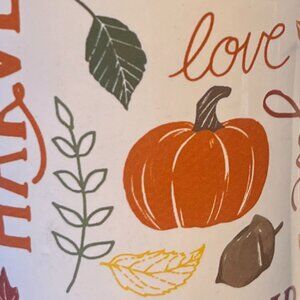 CELEBRATE FALL TOGETHER with this tall ceramic mug featuring a wraparound collage design of whole pumpkins, acorns and leaves interspersed with autumn words and phrases, including: Pumpkin Spice Everything; Cinnamon sticks; Nutmeg Spice; Weather weather; Cozy; Friends; Harvest; Count Your Blessings Twice; Fall, Gather; Love; Give; Crisp Air; Family, and Warm Home. Beautifully colored in warm hues of orange, green, yellow, tan, rust and brown against a white background. White interior. Comfortable and easy-to-grip handle. Dishwasher and microwave safe. Measures 5.75” tall with a 3.25” diameter; 5.25” across including handle. Holds 16 fluid oz. From CELEBRATE TOGETHER.