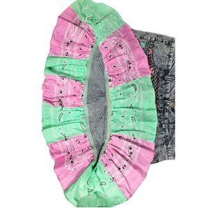 DESCRIPTION: This skirt was created by taking a pair of Celebrity brand denim jean shorts and making them into a skirt, then I added ruffles by sewing together squares made from a pink and green bandanna.