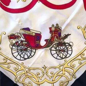 Luxurious silk scarf with intricate carriage design. Features elegant red, black and gold accents. Perfect for adding a touch of sophistication.