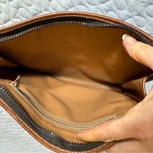 The bag can be used as a pouch or a wristlet, and has gold hardware accents. The handle/strap is made of both leather and PVC materials, and is brown in color. This vintage bag is perfect for any fashion-forward woman who wants to add a touch of luxury to her collection.