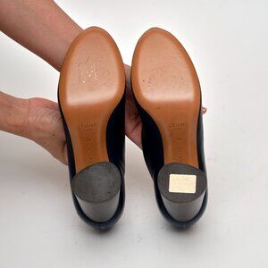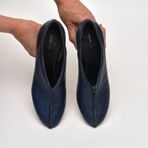 CELINE Navy Blue Leather V Neck Block Heel Pumps