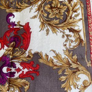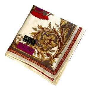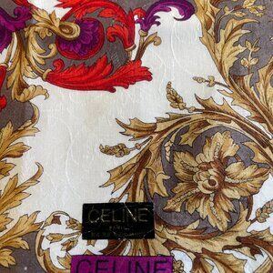 Featuring an intricate baroque-inspired pattern in shades of gold, crimson red, and soft gray, this piece showcases the brand’s timeless attention to detail. The scarf is finished with a rolled hem and classic Celine Paris signature label, making it both elegant and collectible.
