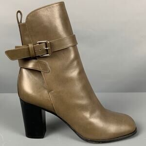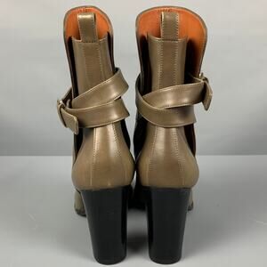 CELINE boots in a grey leather fabric featuring ankle strap with silver tone hardware, and chunky heel. Made in Italy.