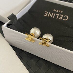 Up for grabs are these gorgeous CELINE - inspired pearl earrings! Features the iconic gold - toned logo detail paired with lustrous faux pearls. Perfect for adding a touch of luxury to any outfit—from everyday chic to evening glam.