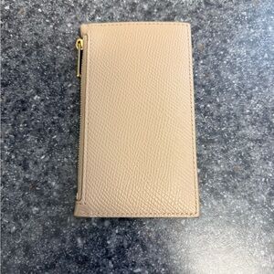 This celine zippered card/coin holder wallet is in excellent preowned condition. It features four card slots on the front and a top zippered pocket with a leather lined interior.