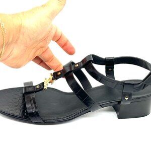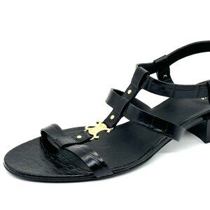 The Celine Triomphe sandals combine crocodile embossed calfskin and delicate straps. Note the French fashion house's goldtone metallic logo on the front of these lightweight shoes.