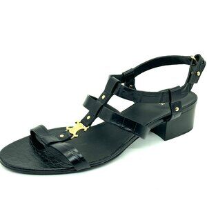 CELINE Triomphe Logo Crocodile Embossed Leather Strappy Block Heel Sandals
