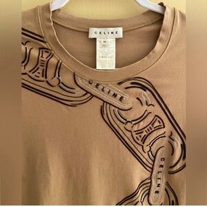 CELINE VINTAGE TRIOMPHE LINKS and CELINE written out. I have only seen 1 of these but there was a lot of fading to the shirt . This is in TRULY AMAZING CONDITION.