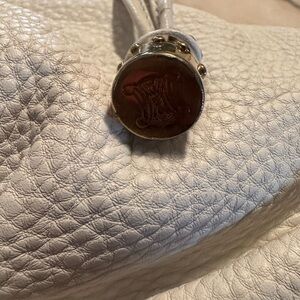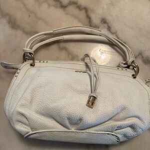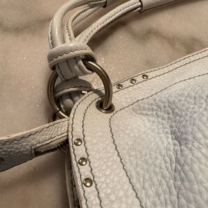 Elegant white leather bag perfect for any occasion. Features a sleek design with gold accents. This purse it lovely however it needs a deep cleaning…Make an offer!