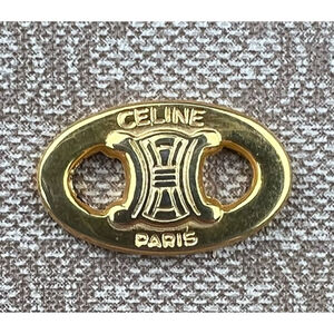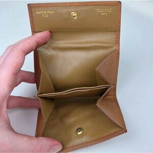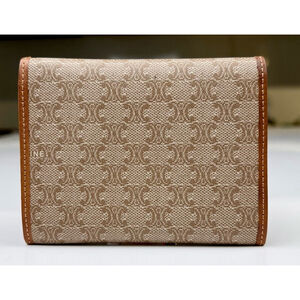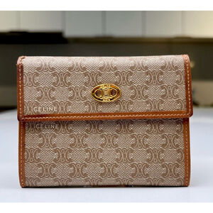 This is a pre-owned Celine wallet. The exterior features a brown and beige canvas with the Celine logo pattern. It has a gold-tone metal clasp with the Celine logo. The edges are trimmed with brown leather. The interior is lined with brown leather and includes compartments for cards and cash. The wallet shows minimal signs of wear consistent with pre-owned condition.