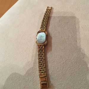 VERY EYE CATCHING CENERE WATCH THAT WILL NEED A BATTERY. WENT TO MY JEWLERY GUY AND IT WILL WORK WITH NEW BATTERY. GOLD PLATED, THIS IS BEAUTIFUL WATCH, FOR SOME REASON GUYS ALWAYS COMPLIMENTED ME REGARDING THIS WATCH. THERE A LITTLE FEW MINOR SCRATCH THAT I CAN SEE, IF YOU LOOKED AT IT LAID FLAT IT IS HIGH RIGHT HAND CORNER. THE GOLD FINISH IS IN GREAT SHAPE. LAID FLAT TOTAL BAND IS 7" FACE OF WATCH ALMOST 1" BAND .5"I DO NOT KNOW WEIGHT OF CRYSTALS BUT SHINE LIKE THE SUN PRESTIN LOOK!!!