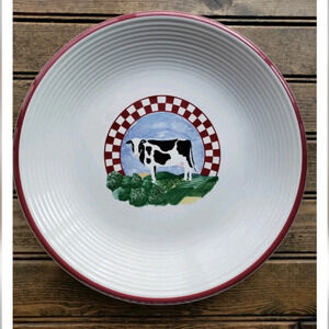 Century Stoneware Fannie's Farm salad/dessert plate 8"/vintage 1980s Century stone stoware Fannies farm 8" dessert plate. Set of two. Central cow, red checkerboard, red band, rimmed edge. in VERY GOOD condition with no, chips, nicks, cracks or fleabites. NO crazing and NO stains.