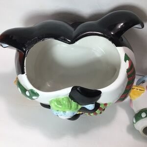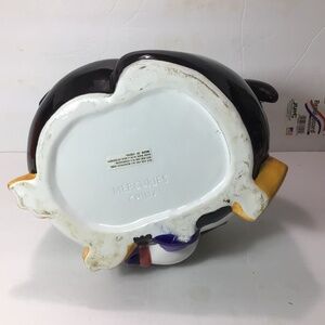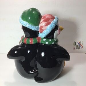 Here we have a very nice ceramic family cookie jar. It stands 12” tall and approx 10” across. It has a small area that was repaired right around the top under the penguins neck wrap. See the pic. Not visible unless you really really look for it. Also, there is a small chip just under the penguins wrap also. With the top portion on, you can just barely see it. This item is very colorful.