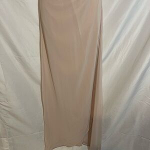 This elegant tan slip dress showcases an asymmetrical design with a plunging neckline and delicate spaghetti straps. Ideal for a cocktail night out, its sleeveless style and wrap features offer a sophisticated and chic look.