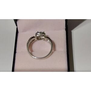 This beauty has a one carat center stone with a halo of small round cut stones. More small round cut pave stones accent the sides of the band in a split style with diamond shaped accents. The stones in the halo and sides are one carat gem weight. The total gem weight of the ring to be 2 carats. It is size 8.