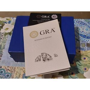 The setting is done in .925 solid sterling and stamped for authenticity and has then been layered in pure platinum. It is size 8. It comes in a gift box and with a GRA Moissanite certificate of authenticity.
