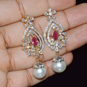 Gorgeous 18K solid gold 24.16CTS natural diamond, ruby and South Sea pearl dangle earrings.
