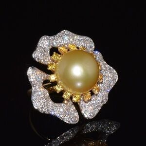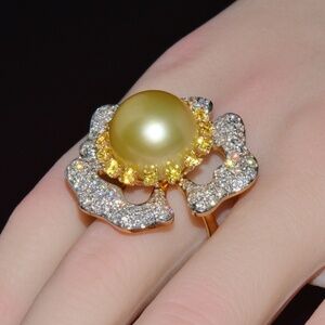This ring features a large 15MM natural golden South Sea pearl in the center. The 22.67CT South Sea pearl is set in a luxurious 18K solid gold floral design with 2.43CTS of round brilliant cut natural diamonds and 1.06CTS of vivid yellow sapphires. The diamonds and sapphires accentuate the radiant golden pearl, creating a dazzling statement piece.