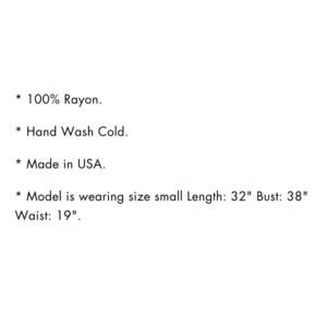 * Model is wearing size small Length: 32" Bust: 38" Waist: 19".