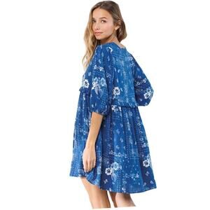 CES Femme Floral Smocking Boho Blue White Dress Size Small Runs large