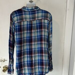 Lightweight washable rating with a blue, green, marroon and white plaid print pattern, roll sleeve, twist front, foldover collar. Excellent condition. Size small, measures 20” from armpit to armpit and 28” from top of shoulder to bottom hem.